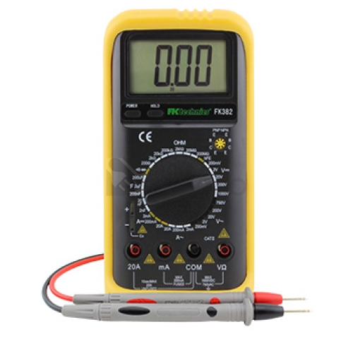 Digitální multimetr s 3 1/2 místným displejem pro každodenní použití při měření základních elektrických veličin.Technické parametry: DC napětí: 200 m / 2 / 20 / 200 / 1000 V AC napětí: 200 m / 2 / 20 / 200 / 750 V DC proud: 2 m / 200 m / 20 A AC proud: 2 m / 200 m / 20 A Odpor: 200 / 2 k / 20 k / 200 k / 2 M / 20 M / 200 MOhm Kapacita: 2 n / 20 n / 200 n / 2 u / 200 uF Test průchodnosti: Ano Test tranzistoru: Ano Test diody: Ano Funkce: DATA HOLD Kategorie přepětí: CAT II 600 V, CAT I 1000 V Napájecí napětí: 9 V (6F22) Rozměry: 190 x 67 x 28 mm Hmotnost: 240 g Poznámka: K multimetru FK382 lze použít následující náhradní měřící kabely s obj.č.: 9901047, 7120087, 7120086, 4800071, 4810398, 108490, 108491, 122285, 108497, 120532.