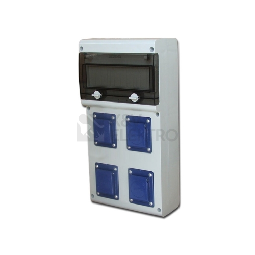 Zásuvková kombinace jištěná jističi a proudovým chráničem s výklopnou rukojetí pro přenášení Jištění: 4x B16/1 1x FI-40A 4x zásuvka IP44: 4x 230V/16A
