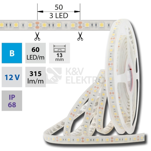 LED pásek SMD5050, 460-475nm (modrá), 14,4W, 60LED, 315lm, segment 50mm, 3LED/segment, IP68, DC 12V, životnost 35000h, šíře 13mm, bílý PCB pásek, max. délka pásku při jednostranném zapojení: 5m, opatřen samolepící páskou 3M. Páska pouze usnadňuje montáž, fixace pomocí spon je nezbytná.