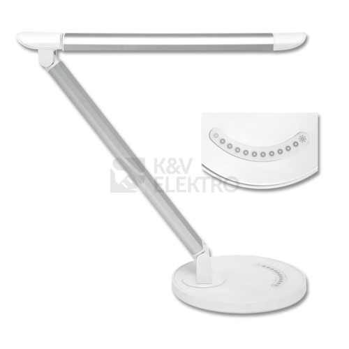 Moderní stmívatelná kancelářská lampa pro osvětlení pracovního prostoru stolu. Využívá vysoce úspornou SMD LED technologii s dlouhou životností. Tělo lampy je opatřeno otočnými klouby pro pohodlné nastavení polohy dle potřeby. Na kulaté základně lampy je umístěn dotykový touch-vypínač/stmívač pro snadné ovládání, který umožňuje osvětlení 7 stupni intenzity světla.
