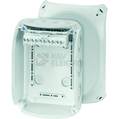 Kabelová krabicová rozvodka z vysoce kvalitního termoplastu pro nechráněnou instalaci ve venkovním prostředí nebo pro nástěnné aplikace v budovách. Odolné proti povětrnostním vlivům, jako například UV záření ze slunečního světla, chráněno proti dešťové vodě, teplotně stálé a nárazuvzdorné. Upevnění víka pomocí rychlouzávěrů. S vnějšími (stěnovými) úchyty. Odolné proti mořské vodě pro použití v přímořských oblastech. Se schválením pro instalaci na lodích. Svorkovnice se 2 svorkami na každý pól do 6 mm², 5pólová. Kabelový vstup přes metrické předlisy ve dně a stěnách skříně. Montážní kabelové vývodky součástí příslušenství. S páskem pro uchycení víka.