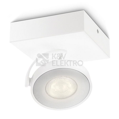 Bílé nástěnné světlo Philips Clockwork má čistý geometrický tvar. Nastavitelná velká hlava obsahuje světla LED umístěná kolem šedého prstence. Disponuje systémem pro snadnou instalaci ClickFIX a funguje se všemi druhy stmívačů.