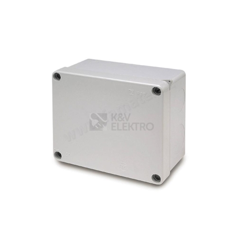 Krabice 3073 IP55 170x140x90mm, plné víko, hladké bokyElektroinstalační krabice s víčkem na plastové šrouby v krytí IP55, rychlá a jednoduchá montáž (šrouby stačit pootočit o 1/4 otáčky), odolnost proti mechanickým nárazům IK07, pro nástěnnou montáž (na omítku), barva šedá, samozhášivý, bezhalogenní UV odolný materiál, bez svorkovnice, otvory do krabice se provádějí vyvrtáním otvoru a následně se osadí vývodka (např. plastová šroubová M16). Splňuje požadavky norem ČSN EN 60670-22, zkouška žhavou smyčkou 650°C (pro montáž na hořlavé podklady doporučujeme použití nehořlavé podložky), pro rozsah teplot od -25°C do +85°C.