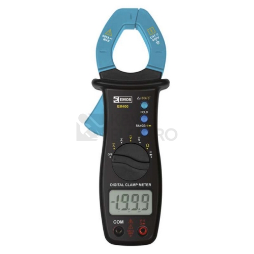 Digitální klešťový multimetrdisplej se zobrazením 3 3/4 digituautomatická i manuální volba rozsahůtlačítko pro záznam právě naměřené hodnotyrozsah DC napětí 400 mV až 600 V, rozsah AC napětí 400 mV až 600 Vrozsah DC proudu 400 až 600 A, rozsah AC proudu 400 až 600 Arozsah odporu 400 ? až 40 M?měření spojitosti obvodůtest diodindikace slabých bateriínapájení: 2x 1,5 AAA (součástí dodávky)součást dodávky - návod, měřící hrotyrozměry 71 x 194 x 38 mmprodejní obal: 1 ks, blistrMULTIMETR KLEŠŤOVÝ EM400