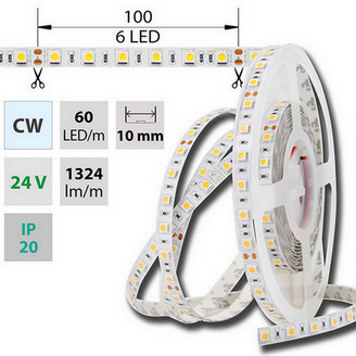 LED pásek SMD5050, 5800-6100K (studeně bílá), 14,4W, 60LED, 1324lm, segment 100mm, 6LED/segment, IP20, DC 24V, životnost 35000h, šíře 10mm, bílý PCB pásek, max. délka pásku při jednostranném zapojení: 7m, opatřen samolepící páskou 3M.