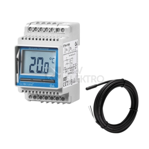 Termostat na DIN, řízení podlahového topení, větracích systémů, okapových žlabů, teplotní rozsah -19,5...+70°C,výstup 3.600 W (1A pro indukční zátěž), včetně jednoho ks kabelového čidla