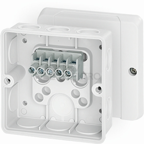 Kabelová krabicová rozvodka z vysoce kvalitního termoplastu pro nástěnné aplikace v budovách nebo chráněnou instalaci ve venkovním prostředí. Kabelový vstup přes pružné těsnící membrány, jednoduchým vsunutím kabelu, není potřeba žádný nástroj. Upevnění víka pomocí šroubů V2A. Se šroubovými svorkami do 4 mm², 5pólové.