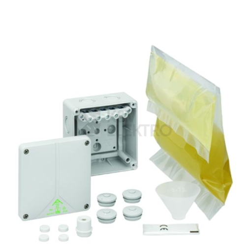 Spojovací krabice, se stupněm krytí IP68, Jmenovitý průřez 6mm², Ui=690V AC, Certifikováno podle VDE (DIN EN 60670-1/-22 (VDE 0606-1/-22) & DIN VDE V 0606-22-100), Vyrážecí membrány, M20/M25, (2 ze zadu, 7 z boku), Vnitřní místa pro připevnění, s šroubovými svorkami k zalití, pro montáž v záplavových oblastech a v zemině bez dopravní zátěže, šedá, s vysoko položenými šroubovými svorkami, 5-pólovými-6mm² (4 x 2,5² / 4 x 4² / 3 x 6²), Rozměry: 110 x 110 x 67mm, Přiložené příslušenství: 4 dvojité membránové vývodky IP66 M25 rozsah těsnění 9-16mm, 2 uzavírací zátky M20, 1 vývodka M20, 1 sáček lité pryskyřice GHB3 s plnicím trychtýřem