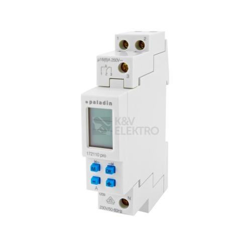 Hodiny spínací PALADIN 172110pro, digitální, týdenní, 1kanál, 1modul, se zálohou, šedé, na DIN, 46 úložných míst