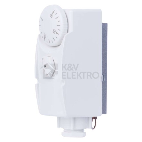 Příložný termostat EMOS T80, je určen pro hlídání teploty potrubí, nebo jiných ploch. Termostat se umisťuje montážní spirálou přímo na hlídaný povrch. Přepínací kontakt umožňuje druh regulace vytápěcí nebo chlazení Nastavení teploty 0 °C až 90 °C, mechanickým otočným kolečkem, rozlišení 5 °C Spínání napěťové 230VAC, 50Hz Spínaná zátěž 16A odporově, 4A induktivně Rozměr termostatu 105x38x54m