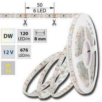 LED pásek SMD3528, 2800-3100K (teple bílá), 5600-6200K (studeně bílá), 9 ,6W, 120LED, 676lm, segment 50mm, 6LED/segment, IP54, DC 12V, životnost 35000h, šíře 8mm, bílý PCB pásek, max. délka pásku při jednostranném zapojení: 5m, opatřen samolepící páskou 3M. Na pásku se střídají LED studené a teple bílé, každý druh se dá nezávisle stmívat.