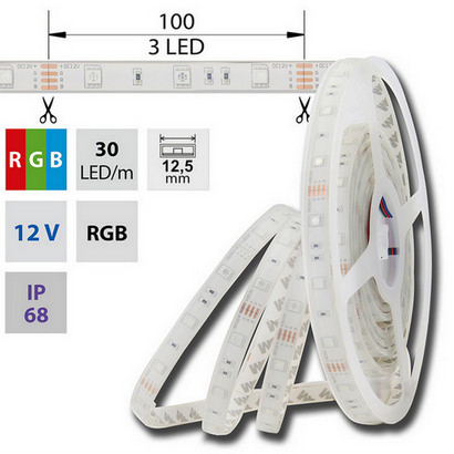 LED pásek SMD5050, RGB - barevný, 7,2W, 30LED, segment 100mm, 3LED/segment, IP68, DC 12V, životnost 35000h, šíře 12,5mm, bílý PCB pá sek, max. délka pásku při jednostranném zapojení: 5m, opatřen samolepící páskou 3M. Páska pouze usnadňuje montáž, fixace pomocí spon je nezbytná.