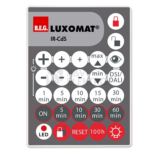 Infračervené dálkové ovládání pro pohodlné nastavení nebo změnu parametrů. Kompletní s nástěnným držákem. Jednoduché naprogramování CdS-DALI/DSI foto electronického spínače. Rozměry : 80 x 60 x 8 mm(in translation) zatažený/tmavý max. 5 až 6 m sluneční svit max. 2 až 3 mAccu: lithium 3,0 VVýrobce: B.E.G. Brück Electronic GmbHBarva: -Výr. číslo: 92577Typ: IR-CdS