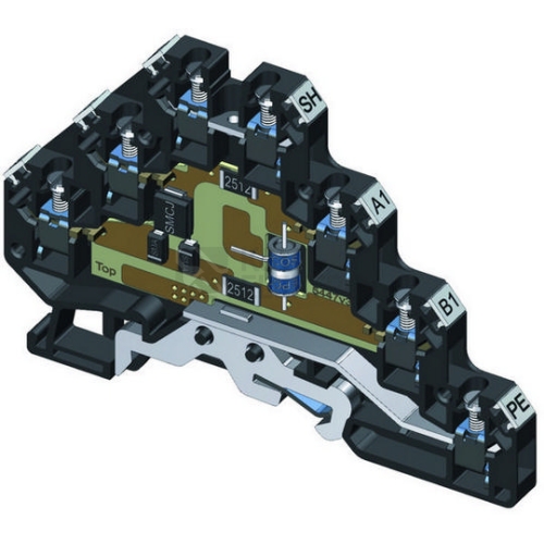 Vazební impedance – odpor, šroubové svorky, dvoustupňová přepěťová ochrana vysokorychlostních dvoužilových signálových linek, instalace těsně před chráněné zařízení, k ochraně rozhraní řídicích systémů MaR, EZS, EPS apod., zejména rozhraní RS 485, RS-232, před pulsním přepětím, proti podélnému přepětí (žíla–ochranná zem) a proti příčnému přepětí (žíla – žíla) hrubá i jemná přepěťová ochrana