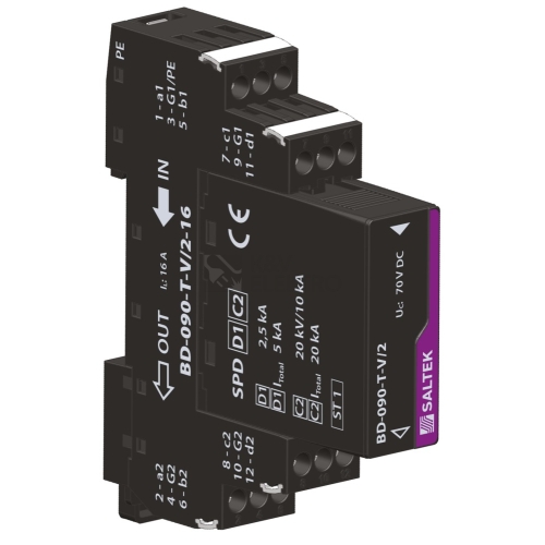 Vyjímatelný modul, svodič bleskových proudů dvou dvoužilových signálových linek, instalace na vstupu do objektu, na rozhraní zón LPZ 0–LPZ 1 a vyšších, k ochraně sdělovacích, datových a jiných vedení před pulsním přepětím