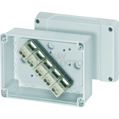 Kabelové rozvodky se stenami skríní bez predlisu. Urceno pro vnitrní prostredí a chránené venkovní prostredí podle DIN VDE 0100, díl 737. pro teplotu prostredí max. + 40 °C a min. - 25 °C, pri relativní vlhkosti vzduchu 50% pri 40 °C nebo 100% pri 25 °C. Tepelná odolnost materiálu od - 40 °C do 70 °C, Odolnost proti požáru podle VDE 0471, díl 2 - Zkouška žhavou smyckou 750 °C, UL Subject 94 V-2. Krytí podle IEC 60529: IP 65. Materiál: Termoplast,. Barva: šedá, RAL 7035. Upevnovací šrouby víka z nerezové oceli V2A. Výrobek: HENSEL DK. Jmenovitý prurez: 10 mm², 5pol. svorka
