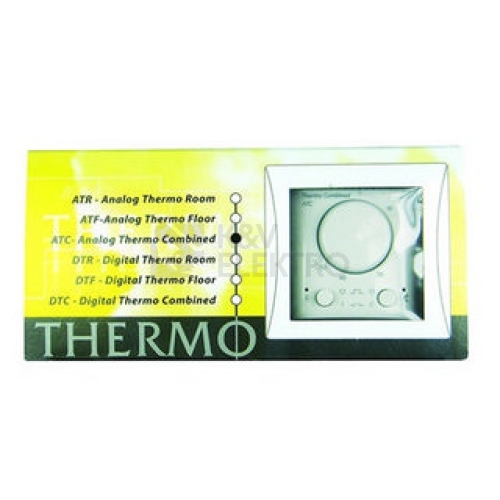 Prostorový termostat s teplotním rozsahem +5.. +40 °C s vestavěným (interním) senzorem. ATF - Analog Thermo FLOOR Podlahový termostat s teplotním rozsahem +5.. +50 °C. Funkce „dočasná změna teploty“ v rozsahu ±10 °C (noční pokles nebo zvýšení teploty). ATC- Analog Thermo COMBINED Kombinovaný termostat s prostorovým i podlahovým senzorem, senzory jsou zapojené v sérii a navzájem se blokují. Funkce „ noční pokles“ pevně nastavená na -5 °C. Teplotní rozsah +5.. +50 °C platný pro oba senzory (nastavují se samostatně). Lze provozovat v režimu ATR (bez externího senzoru). K PŘÍSTROJŮM nutno doobjednat rámeček v designu Elegant a externí senzor (vyjma ATR, DTR). TECHNICKÉ PARAMETRY ATR - Analog Thermo ROOM Tyto termostaty mají analogové ovládání a každý má jiné teplotní rozsahy a použití. POPIS Spínání nočního poklesu se provádí tlačítkem nebo externím kontaktem (pouze u ATR) Nastavení nočního poklesu se provádí pomocným ovladačem (pod hlavním ovladačem a pouze u ATR , ATF) Nastavení ofsetu (kalibrace ±10 °C) se „známým“ teploměrem V nabídce máme také cenově zvýhodněné komplety: komplet ATR - termostat ATR + bílý rámeček Elegant komplet ATF - termostat ATF + bílý rámeček Elegant + teplotní senzor TC-3m komplet ATC - termostat ATC + bílý rámeček Elegant + teplotní senzor TC-3m Možnost specifikovat při objednávce také jinou barvu rámečku.