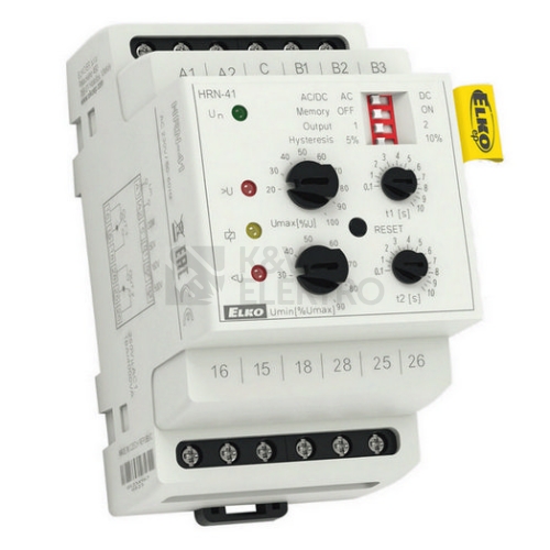 Používá se pro hlídání DC i AC jednofázových napětí ve třech rozsazích. POPIS Kontrola velikosti napětí ve dvou nezávislých úrovních (přepětí/podpětí). Nastavitelná funkce PAMĚŤ – pro návrat z chybového do normálního stavu je třeba stisknout tlačítko RESET Funkce druhého relé (samostatně/paralelně) Nastavitelná prodleva pro eliminaci krátkodobých výpadků a špiček pro každou úroveň. Nastavení hlídané úrovně Umax (v % rozsahu) a hlídané úrovně Umin (v % z nastavené horní meze – funkce HYSTEREZE) galvanicky oddělené napájení od měřících vstupů (oproti hlídacím relé řady HRN-3) TECHNICKÉ PARAMETRY napájecí napětí AC 230 V, AC 400 V nebo AC/DC 24 V hlídané rozsahy 1. rozsah: 10 – 50 V (vstupní odpor 212 k?, max. trvalé napětí 100 V) 2. rozsah: 32 – 160 V (vstupní odpor 676 k?, max. trvalé napětí 300 V) 3. rozsah: 100 – 500 V (vstupní odpor 2,12 M?, max. trvalé napětí 600 V) výstupní kontakt: 2x přepínací 16 A/250 V AC1 (AgNi, 4 000 VA) pro každou sledovanou úroveň napětí v provedení 3-MODUL, upevnění na DIN lištu