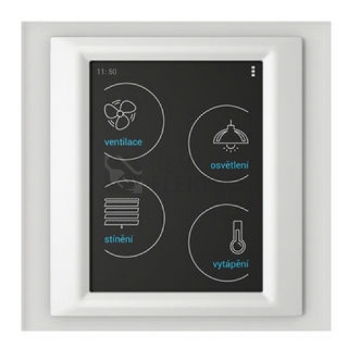 Bezdrátová dotyková ovládací jednotka RF Touch je centrálním ovládáním pro vytápění, spínání elektrospotřebičů a zařízení, stmívání světel, ovládání žaluzií. POPIS Vysílá a přijímá povely od prvků, zpracovává nastavené programy pro automatickou regulaci. Lze kombinovat až s 40 prvky iNELS RF Control + 30 detektory Oasis (instalaci můžete postupně rozšiřovat od 1 prvku). Obousměrná komunikace, vysílá a přijímá povely a zobrazuje status prvků. Automatické ovládání na základě týdenního programu. Barevné kombinace RF Touch (lze vybrat na eshopu): Rámečky v základním plastovém provedení (bílá, černá, červená) nebo v luxusním designu LOGUS90 - sklo, kov (hliník, nikl, titan). Mezirámečky v základní bílé a tmavě šedé barvě nebo s metalickým nástřikem hliníkové, perleťové, ledové a šedé. Zadní kryt pro RF Touch-W vybírejte ze škály barev bílá, slonová kost, světle šedá, tmavě šedá. TECHNICKÉ PARAMETRY Napájecí napětí AC 100 – 230 V. Dotykový 3,5 palcový barevný TFT LCD displej. Dosah 100m (volné prostranství), v případě nedostatečného signálu mezi ovladačem a prvkem použijte opakovač signálu RFRP-20. Komunikační frekvence (868MHz, 866MHz, 916MHz, 922MHz) s obousměrným protokolem RFIO nebo RFIO2. RFIO2 je inovovaný bezdrátový komunikační protokol systému iNELS RF Control, který přináší větší stabilitu a el iminuje kolizi signálů mezi jednotlivými prvky. Montáž na zeď – s upevněním na instalační krabici nebo přilepením na sklo, dřevo, sádrokarton.