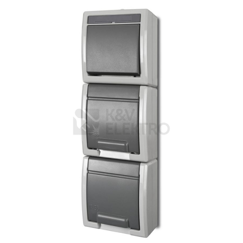 ATLAS 19096 IP55 Přepínač č.6 + zásuvka 2x 2P+PE, 2-násobná svisle s ochr. kolíkem, na povrch, šedýSpínače a zásuvky ve vyšším krytí ATLAS IP55 s gumovou průchodkou (pro kabely do průměru 13,5 mm a trubky do 16 mm) jsou speciálně navrženy do prostředí se zvýšeným výskytem vlhkosti a prachu. Provedení v šedé barvě RAL 7035 a ovládacím prvkem v barvě RAL 7043 a odolnost proti mechanickým nárazům IK07 předurčuje použití ve výrobních provozech, montážních halách, garážích, dílnách apod. Kompaktní a zároveň masivní pouzdro z odolného plastu zaručují dlouhou životnost přístrojů.Popisovací štítek, který je součástí spínače, zajistí přehledné označení každého přístroje, určeno pro nástěnnou montáž (na omítku), UV odolný materiál. Splňuje požadavky norem ČSN EN 60669-1 (spínače) a ČSN IEC 60884-1 (zásuvky), pro montáž na hořlavé podklady doporučujeme použití nehořlavé podložky, pro rozsah teplot od -25°C do +70°C.