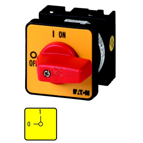 Vačkové spínače podle ČSN/EN60947, konstrukční velikost T0, tvar při montáži, žlutý přední štítek 48x48, stupeň krytí vpředu IP65 s červenou pákou, jmenovitý trvalý proud Iu 20 A, jmenovité provozní napětí Ue 690V, příslušenství k dodání podle údajů v katalogu Vačkové spínače T. Konstrukční formy všeobecně: skříňky pro povrchovou montáž z izolačního materiálu, montáž, centrální upevnění, základní montáž, montáž do rozváděče IVS