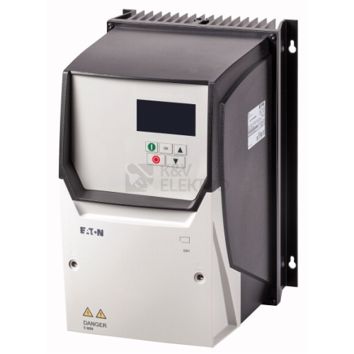 Frekvenční měnič, Označení typu: DA1, Jmenovité provozní napětí: Ue = 230 V AC, 3fázový, 240 V AC, 3fázový, Výstupní napětí při Ue: U2 = 230 V AC, 3fázový, 240 V AC, 3fázový, Síťové napětí (50/60Hz): ULN = 200 (-10%) - 240 (+10%) V, Jmenovitý pracovní proud při přetížení 150 %: Ie = 18 A, Upozornění: Jmenovitý provozní proud při spínací frekvenci 16 kHz a teplotě prostředí +40 °C, Upozornění: Cyklus přetížení po 60 s každých 600 s, Přiřazený jmenovitý výkon motora Upozornění: pro normální čtyřpólové třífázové asynchronní motory s vnitřním a vnějším chlazením s počtem otáček 1500 min-1 při 50 Hz nebo 1800 min-1 při 60 Hz, Cyklus přetížení po 60 s každých 600 s, při 230 V, 50 Hz, Přiřazený jmenovitý výkon motora Přetížení 150 %: P = 4 kW, Přetížení 150 %: IM = 14.8 A, Přiřazený jmenovitý výkon motora Upozornění: při 220 - 240 V, 60 Hz, Přiřazený jmenovitý výkon motora Přetížení 150 %: P = 5 HP, Přiřazený jmenovitý výkon motora Přetížení 150 %: IM = 15.2 A, Stupeň krytí: IP66/NEMA 4X, Rozhraní/provozní sběrnice (integrovaná): OP-Bus (RS485)/Modbus RTU, CANopen®, Komunikační karta (volitelně): Ethernet IP, DeviceNet, PROFIBUS, PROFINET, Modbus-TCP, EtherCAT, Vybavení: Odrušovací filtr, Brzdový střídač, dodatečná ochrana plošných spojů, OLED indikátor, Konstrukční velikost: FS3, Normy a ustanovení: Všeobecné požadavky: ČSN EN 61800-2, Požadavky EMC: ČSN EN 61800-3, Požadavky na bezpečnost: ČSN EN 61800-5-1