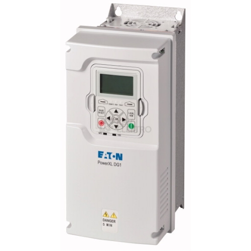 Frekvenční měnič, Označení typu: DG1, Jmenovité provozní napětí: Ue = 400 V AC, 3fázový, 480 V AC, 3fázový, 500 V AC, 3fázový, Výstupní napětí při Ue: U2 = 400 V AC, 3fázový, 480 V AC, 3fázový, 500 V AC, 3fázový, Síťové napětí (50/60Hz): ULN = 380 (-15%) - 500 (+10%) V, Jmenovitý pracovní proud při přetížení 150 %: Ie = 4.3 A, Upozornění: Jmenovitý provozní proud při spínací frekvenci 1 - 12 kHz a teplotě prostředí +50 °C pro přetížení 150 % a +40 °C pro přetížení 110 %., Jmenovitý pracovní proud při přetížení 110 %: Ie = 5.6 A, Upozornění: Cyklus přetížení po 60 s každých 600 s, Přiřazený jmenovitý výkon motora Upozornění: pro normální čtyřpólové třífázové asynchronní motory s vnitřním a vnějším chlazením s počtem otáček 1500 min-1 při 50 Hz nebo 1800 min-1 při 60 Hz, Cyklus přetížení po 60 s každých 600 s, při 400 V, 50 Hz, Přiřazený jmenovitý výkon motora Přetížení 150 %: P = 1.5 kW, Přetížení 110 %: P = 2.2 kW, Přetížení 150 %: IM = 3.6 A, Přetížení 110 %: IM = 5 A, Přiřazený jmenovitý výkon motora Upozornění: při 500 V, 50 Hz, Přiřazený jmenovitý výkon motora Přetížení 150 %: P = 2.2 kW, Přetížení 110 %: P = 3 kW, Přetížení 150 %: IM = 4 a, Přetížení 110 %: IM = 5.3 a, Přiřazený jmenovitý výkon motora Upozornění: při 480 V, 60 Hz, Přiřazený jmenovitý výkon motora Přetížení 150 %: P = 2 HP, Přetížení 110 %: P = 3 HP, Přiřazený jmenovitý výkon motora Přetížení 150 %: IM = 3.4 A, Přetížení 110 %: IM = 4.8 A, Stupeň krytí: IP21/NEMA1, Rozhraní/provozní sběrnice (integrovaná): Modbus RTU, Modbus TCP, BACnet MS/TP, Ethernet IP, Komunikační karta (volitelně): PROFIBUS, CANopen®, DeviceNet, SmartWire-DT, Vybavení: Odrušovací filtr, dodatečná ochrana plošných spojů, víceřádkový grafický displej, Brzdový střídač, Meziobvodová tlumivka, Konstrukční velikost: FS1, Normy a ustanovení: Všeobecné požadavky: ČSN EN 61800-2, Požadavky EMC: ČSN EN 61800-3, Požadavky na bezpečnost: ČSN EN 61800-5, IEC/EN 60950-1: SELF