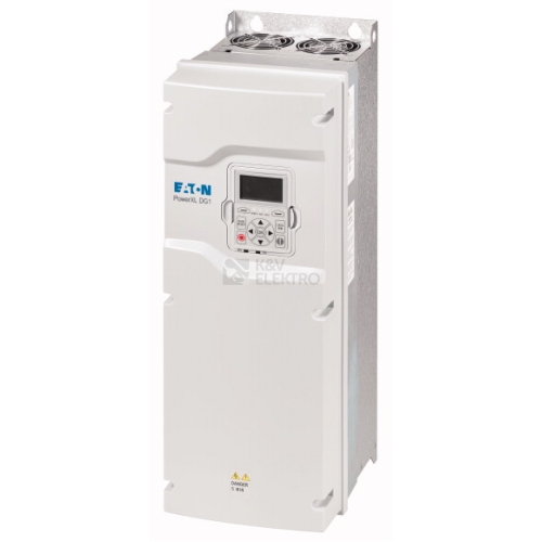 Frekvenční měnič, Označení typu: DG1, Jmenovité provozní napětí: Ue = 400 V AC, 3fázový, 480 V AC, 3fázový, 500 V AC, 3fázový, Výstupní napětí při Ue: U2 = 400 V AC, 3fázový, 480 V AC, 3fázový, 500 V AC, 3fázový, Síťové napětí (50/60Hz): ULN = 380 (-15%) - 500 (+10%) V, Jmenovitý pracovní proud při přetížení 150 %: Ie = 46 A, Upozornění: Jmenovitý provozní proud při spínací frekvenci 1 - 12 kHz a teplotě prostředí +50 °C pro přetížení 150 % a +40 °C pro přetížení 110 %., Jmenovitý pracovní proud při přetížení 110 %: Ie = 61 A, Upozornění: Cyklus přetížení po 60 s každých 600 s, Přiřazený jmenovitý výkon motora Upozornění: pro normální čtyřpólové třífázové asynchronní motory s vnitřním a vnějším chlazením s počtem otáček 1500 min-1 při 50 Hz nebo 1800 min-1 při 60 Hz, Cyklus přetížení po 60 s každých 600 s, při 400 V, 50 Hz, Přiřazený jmenovitý výkon motora Přetížení 150 %: P = 22 kW, Přetížení 110 %: P = 30 kW, Přetížení 150 %: IM = 41 A, Přetížení 110 %: IM = 55.2 A, Přiřazený jmenovitý výkon motora Upozornění: při 500 V, 50 Hz, Přiřazený jmenovitý výkon motora Přetížení 150 %: P = 30 kW, Přetížení 110 %: P = 37 kW, Přetížení 150 %: IM = 44 a, Přetížení 110 %: IM = 54 a, Přiřazený jmenovitý výkon motora Upozornění: při 480 V, 60 Hz, Přiřazený jmenovitý výkon motora Přetížení 150 %: P = 30 HP, Přetížení 110 %: P = 40 HP, Přiřazený jmenovitý výkon motora Přetížení 150 %: IM = 40 A, Přetížení 110 %: IM = 52 A, Stupeň krytí: IP54/NEMA12, Rozhraní/provozní sběrnice (integrovaná): Modbus RTU, Modbus TCP, BACnet MS/TP, Ethernet IP, Komunikační karta (volitelně): PROFIBUS, CANopen®, DeviceNet, SmartWire-DT, Vybavení: Odrušovací filtr, dodatečná ochrana plošných spojů, víceřádkový grafický displej, Brzdový střídač, Meziobvodová tlumivka, Konstrukční velikost: FS3, Normy a ustanovení: Všeobecné požadavky: ČSN EN 61800-2, Požadavky EMC: ČSN EN 61800-3, Požadavky na bezpečnost: ČSN EN 61800-5, IEC/EN 60950-1: SELF
