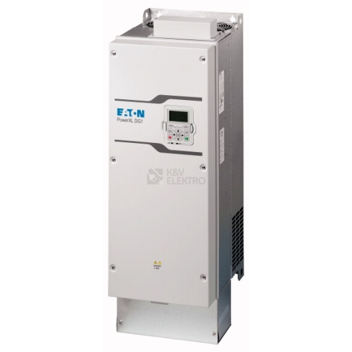 Frekvenční měnič, Označení typu: DG1, Jmenovité provozní napětí: Ue = 400 V AC, 3fázový, 480 V AC, 3fázový, 500 V AC, 3fázový, Výstupní napětí při Ue: U2 = 400 V AC, 3fázový, 480 V AC, 3fázový, 500 V AC, 3fázový, Síťové napětí (50/60Hz): ULN = 380 (-15%) - 500 (+10%) V, Jmenovitý pracovní proud při přetížení 150 %: Ie = 140 A, Upozornění: Jmenovitý provozní proud při spínací frekvenci 1 - 10 kHz a teplotě prostředí +50 °C pro přetížení 150 % a +40 °C pro přetížení 110 %., Jmenovitý pracovní proud při přetížení 110 %: Ie = 170 A, Upozornění: Cyklus přetížení po 60 s každých 600 s, Přiřazený jmenovitý výkon motora Upozornění: pro normální čtyřpólové třífázové asynchronní motory s vnitřním a vnějším chlazením s počtem otáček 1500 min-1 při 50 Hz nebo 1800 min-1 při 60 Hz, Cyklus přetížení po 60 s každých 600 s, při 400 V, 50 Hz, Přiřazený jmenovitý výkon motora Přetížení 150 %: P = 75 kW, Přetížení 110 %: P = 90 kW, Přetížení 150 %: IM = 134 A, Přetížení 110 %: IM = 161 A, Přiřazený jmenovitý výkon motora Upozornění: při 500 V, 50 Hz, Přiřazený jmenovitý výkon motora Přetížení 150 %: P = 90 kW, Přetížení 110 %: P = 110 kW, Přetížení 150 %: IM = 129 a, Přetížení 110 %: IM = 157 a, Přiřazený jmenovitý výkon motora Upozornění: při 480 V, 60 Hz, Přiřazený jmenovitý výkon motora Přetížení 150 %: P = 100 HP, Přetížení 110 %: P = 125 HP, Přiřazený jmenovitý výkon motora Přetížení 150 %: IM = 124 A, Přetížení 110 %: IM = 156 A, Stupeň krytí: IP54/NEMA12, Rozhraní/provozní sběrnice (integrovaná): Modbus RTU, Modbus TCP, BACnet MS/TP, Ethernet IP, Komunikační karta (volitelně): PROFIBUS, CANopen®, DeviceNet, SmartWire-DT, Vybavení: Odrušovací filtr, dodatečná ochrana plošných spojů, víceřádkový grafický displej, Meziobvodová tlumivka, Konstrukční velikost: FS5, Normy a ustanovení: Všeobecné požadavky: ČSN EN 61800-2, Požadavky EMC: ČSN EN 61800-3, Požadavky na bezpečnost: ČSN EN 61800-5, IEC/EN 60950-1: SELF