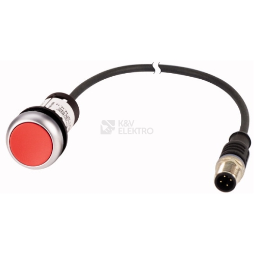 Tlačítko, RMQ compact solution, Kompletní přístroj, Konstrukční typ: ploché, bez aretace, Typ připojení: Kabel (černý) se zástrčkou M12A, 4-pólový, Délka kabelu: 0.5 M, Popis: -, Tlačítkový výplň: červený, Panel s tlačítky nepopsané, Popis: bez, Stupeň krytí: IP66, IP67, IP69K (čelní), IP65 (zadní), Pierścień czołowy tytanowy, Připojení na SmartWire-DT: ne, Kontakty Ö = rozpínací kontakt: 1 rozpínací kontakt, Kontakty Upozornění: = bezpečnostní funkce pomocí nuceného rozpojení podle normy IEC/EN 60947-5-1, Dráha akčního členu a ovládací síly podle ČSN EN 60947-5-1, K.5.4.1 Dráha nuceného otevření: mm 4.65, maximální dráha: mm 5.7, Minimální síla pro nucené otevření: N 15, Nucené rozpínání (ZW): ano, Normy a ustanovení: IEC/EN 60947-5-1, VDE 0660