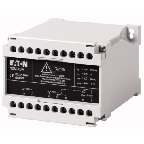Volitelné příslušenství k řadě výkonových spínačů NZM nabízí bohaté portfolio možností využití při nasazení na celém světě. Montáž je vždy pružná a jednoduchá díky modulárním funkčním skupinám. Upozornění: Kondenzátorová jednotka 230 V 50/60 Hz ve spojení s vypínací spouští NZM..-XA208-250AC/DC. Kryt: Stupeň krytí IP20. Není sxchváleno dle UL/CSA.Umožňuje bezpečné použití výkonového jističe jako spínače mřížové sítě v rozsahu 0-110 % Un s konstantní dobou vypínání 40 ms. Při chybějícím síťovém napětí dodává vestavěný kondenzátor po dobu nejméně 12 hodin energii potřebnou k ovládání vypínací spouště. Uspořádání kondenzátorové jednotky se provádí nezávisle na spínači. Kondenzátorovou jednotku připojte na napájecí straně. Upozornění k projektování: Standardní pomocné spínače (HIN) zapojte jako spínací kontakt v sérii s cívkou vypínací spouště! Standardní pomocné spínače nejsou obsaženy v rozsahu dodávky. Lze použít pro: NZM1(-4), N(S)1(-4), NZM2(-4), N(S)2(-4), NZM3(-4), N(S)3(-4), NZM4(-4), N(S)4(-4)