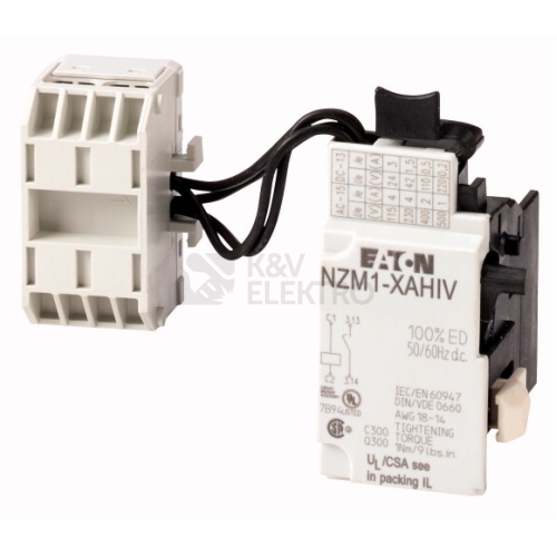 Volitelné příslušenství k řadě výkonových spínačů NZM nabízí bohaté portfolio možností využití při nasazení na celém světě. Montáž je vždy pružná a jednoduchá díky modulárním funkčním skupinám. Upozornění: Ne ve spojení s dálkovým pohonem NZM..-XR.. Jestliže vypínací spoušť vede napětí, brání bezpečně dotyku hlavních kontaktů spínače při pokusech o zapnutí. Předbíhání pomocného kontaktu při zapínání a vypínání (ruční ovládání) cca 20 ms. Vypínací spoušť nelze instalovat současně s předbíhajícím pomocným spínačem NZM..-XHIV.. nebo podpěťovou spouští NZM..-XU.. Lze použít pro: NZM1(-4), N(S)1(-4)