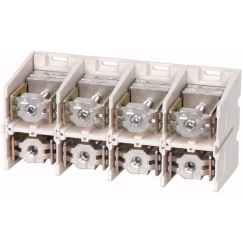 Připojovací svorky K, pro AL a CU, jedna strana kulatá, druhá plochá, jmenovitý povozní proud Ie=800 A, počet pólů=4, průřezy připojení: měděný kulatý kabel o více vodičích, sektorový kabel vícedrátový, kulatý kabel jednodrátový, sektorový kabel jednodrátový a hliníkový kulatý kabel jednodrátový, sektorový kabel jednodrátový=2x120-240 nebo 3x50-185 qm² nebo hliníkový sektorový kabel jednodrátový=2c150-185 nebo 3x95-150 qm². Jiná strana: Cu pás 2x(11x21x1) nebo Cu lišta 50x20 mm, upozornění: Sady na přestavbu z napojení pásu na napojení kabelu jsou k dostání samostatně, kryty svorek k dostání samostatně