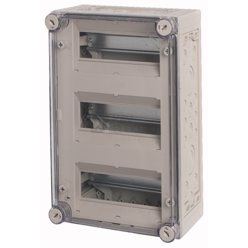 Individuální kryt automatu, material: Polykarbonát, odolný proti nárazům, stupeň krytí IP65, metrické vylamovací otvory ve všech boč nicích, vestavné přístroje konstrukční velikosti 1 podle normy DIN 43880, kryt průhledný se zamykacími rukojeťmi, průhledné dveře k obsluze vestavných přístrojů, DIN lišty k uchycení přístrojů, zaslepovací pás do nepoužívaných vestavných míst, krycí panel s popis ovacím páskem, sběrnice PE/N včetně, upevňovací oka k upevnění na stěnu, upevňovací šrouby s možností plombování, počet HP=27, svorky PE a N, počet x průřez=po 4x(6-35) mm² a 20x(1-4) mm², provedení krytu: průhledné, provedení dveří: žádné