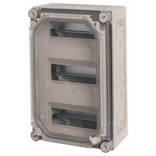 Individuální kryt automatu s dvířky, material: Polykarbonát, odolný proti nárazům, stupeň krytí IP65, metrické vylamovací otvory ve všech bočnicích, vestavné přístroje konstrukční velikosti 1 podle normy DIN 43880, kryt průhledný se zamykacími rukojeťmi, průhledné dveře k obsluze vestavných přístrojů, DIN lišty k uchycení přístrojů, zaslepovací pás do nepoužívaných vestavných míst, krycí panel s popisovacím páskem, sběrnice PE/N včetně, upevňovací oka k upevnění na stěnu, upevňovací šrouby s možností plombování, počet HP=27, svorky PE a N, počet x průřez=po 4x(6-35) mm² a 20x(1-4) mm², provedení krytu: průhledné, provedení dveří: průhledné