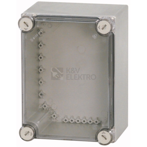 Skříňka s průhledným víkem, material: Polykarbonát, odolná proti nárazům, stupeň krytí IP65, volitelně uzamykatelná s DVZ...-CI, pat entované upevňovací šrouby víka s integrovaným vyrovnáním přetlaku, bočnice hladké, bez vylamovacích otvorů, upevňovací oka k upevnění na stěnu, upevňovací šrouby s možností plombování, RAL 7032, štěrkově šedá (dolní část skříňky), průhledná, bezbarvá (víko), vestavná hloubka s montážním plechem=125 mm, provedení krytu: průhledné, provedení dolní části: hladké
