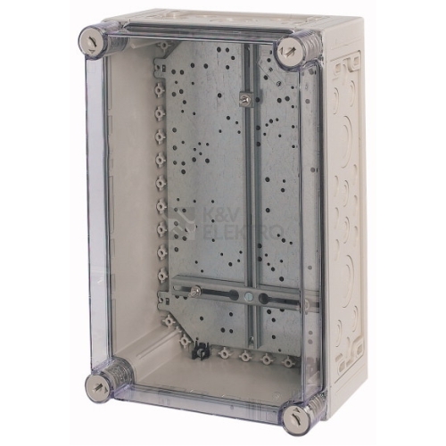 Elektroměrová skřínka, material: Polykarbonát, odolná proti nárazům, patentované upevňovací šrouby víka s integrovaným vyrovnáním přetlaku, hloubka=175 mm, metrické vylamovací otvory ve všech bočnicích, upevňovací oka k upevnění na stěnu, upevňovací šrouby s možností plombování na horní hraně víka, kříž počitadla podle DIN 43853 včetně šroubů a matic k upevnění počitadla, stupeň krytí IP65, provedení krytu: průhledné