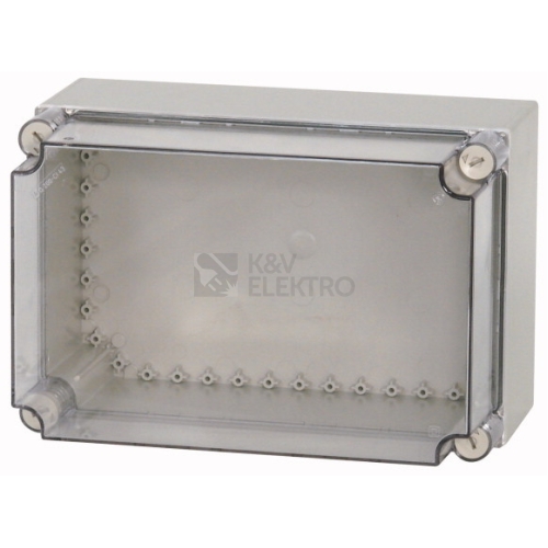 Skříňka s průhledným víkem, material: Polykarbonát, odolná proti nárazům, stupeň krytí IP65, volitelně uzamykatelná s DVZ...-CI, pat entované upevňovací šrouby víka s integrovaným vyrovnáním přetlaku, bočnice hladké, bez vylamovacích otvorů, upevňovací oka k upevnění na stěnu, upevňovací šrouby s možností plombování, RAL 7032, štěrkově šedá (dolní část skříňky), průhledná, bezbarvá (víko), vestavná hloubka s montážním plechem=200 mm, provedení krytu: průhledné, provedení dolní části: hladké