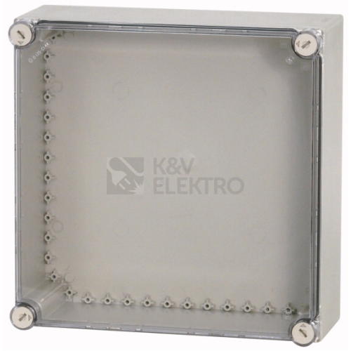 Skříňka s průhledným víkem, material: Polykarbonát, odolná proti nárazům, stupeň krytí IP65, volitelně uzamykatelná s DVZ...-CI, pat entované upevňovací šrouby víka s integrovaným vyrovnáním přetlaku, bočnice hladké, bez vylamovacích otvorů, upevňovací oka k upevnění na stěnu, upevňovací šrouby s možností plombování, RAL 7032, štěrkově šedá (dolní část skříňky), průhledná, bezbarvá (víko), vestavná hloubka s montážním plechem=125 mm, provedení krytu: průhledné, provedení dolní části: hladké