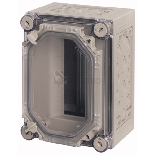 Individuální kryt automatu s dvířky, material: Polykarbonát, odolný proti nárazům, stupeň krytí IP65, metrické vylamovací otvory ve všech bočnicích, vestavné přístroje konstrukční velikosti 1 podle normy DIN 43880, kryt průhledný se zamykacími rukojeťmi, průhledné dveře k obsluze vestavných přístrojů, DIN lišty k uchycení přístrojů, zaslepovací pás do nepoužívaných vestavných míst, krycí panel s popisovacím páskem, sběrnice PE/N včetně, upevňovací oka k upevnění na stěnu, upevňovací šrouby s možností plombování, počet HP=9, svorky PE a N, počet x průřez=po 2x(6-16) mm² a 7x(1-4) mm², provedení krytu: průhledné, provedení dveří: průhledné