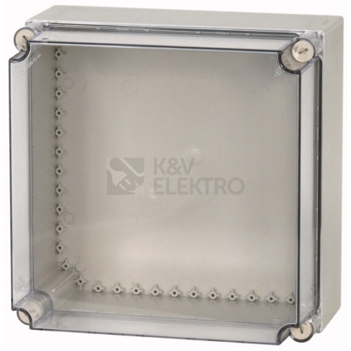Skříňka s průhledným víkem, material: Polykarbonát, odolná proti nárazům, stupeň krytí IP65, volitelně uzamykatelná s DVZ...-CI, pat entované upevňovací šrouby víka s integrovaným vyrovnáním přetlaku, bočnice hladké, bez vylamovacích otvorů, upevňovací oka k upevnění na stěnu, upevňovací šrouby s možností plombování, RAL 7032, štěrkově šedá (dolní část skříňky), průhledná, bezbarvá (víko), vestavná hloubka s montážním plechem=200 mm, provedení krytu: průhledné, provedení dolní části: hladké