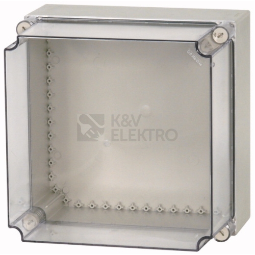 Skříňka s průhledným víkem, material: Polykarbonát, odolná proti nárazům, stupeň krytí IP65, volitelně uzamykatelná s DVZ...-CI, pat entované upevňovací šrouby víka s integrovaným vyrovnáním přetlaku, bočnice hladké, bez vylamovacích otvorů, upevňovací oka k upevnění na stěnu, upevňovací šrouby s možností plombování, RAL 7032, štěrkově šedá (dolní část skříňky), průhledná, bezbarvá (víko), vestavná hloubka s montážním plechem=250 mm, provedení krytu: průhledné, provedení dolní části: hladké