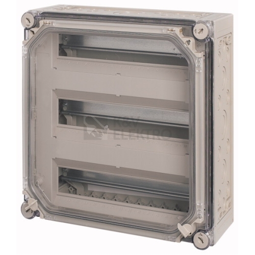 Individuální kryt automatu s dvířky, material: Polykarbonát, odolný proti nárazům, stupeň krytí IP65, metrické vylamovací otvory ve všech bočnicích, vestavné přístroje konstrukční velikosti 1 podle normy DIN 43880, kryt průhledný se zamykacími rukojeťmi, průhledné dveře k obsluze vestavných přístrojů, DIN lišty k uchycení přístrojů, zaslepovací pás do nepoužívaných vestavných míst, krycí panel s popisovacím páskem, sběrnice PE/N včetně, upevňovací oka k upevnění na stěnu, upevňovací šrouby s možností plombování, počet HP=45, svorky PE a N, počet x průřez=po 4x(6-35) mm² a 20x(1-4) mm², provedení krytu: průhledné, provedení dveří: průhledné