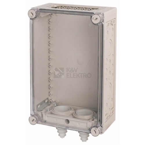 Skříňka s kabelovou přírubou s namontovaným kabelovým vývodem, material: Polykarbonát, odolná proti nárazům, stupeň krytí IP65, patentované upevňovací šrouby víka s integrovaným vyrovnáním přetlaku, bočnice uzavřené, vylamovací, stěny nahoře nebo dole otevřené, kabely lze vložit zepředu přes dělené kabelové spony, upevňovací šrouby s možností plombování, RAL 7032, štěrkově šedá (dolní část skříňky), průhledná, bezbarvá (víko), vestavná hloubka s montážním plechem=125 mm, provedení krytu: průhledné, provedení dolní části: nahoře otevřené, dole kabelové hrdlo