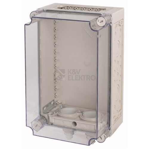 Skříňka s kabelovou přírubou s namontovaným kabelovým vývodem, material: Polykarbonát, odolná proti nárazům, stupeň krytí IP65, patentované upevňovací šrouby víka s integrovaným vyrovnáním přetlaku, bočnice uzavřené, vylamovací, stěny nahoře nebo dole otevřené, kabely lze vložit zepředu přes dělené kabelové spony, upevňovací šrouby s možností plombování, RAL 7032, štěrkově šedá (dolní část skříňky), průhledná, bezbarvá (víko), vestavná hloubka s montážním plechem=200 mm, provedení krytu: průhledné, provedení dolní části: nahoře otevřené, dole kabelové hrdlo
