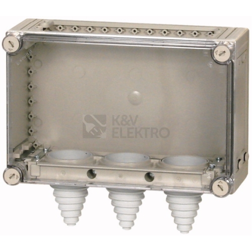 Skříňka s kabelovou přírubou s namontovaným kabelovým vývodem, material: Polykarbonát, odolná proti nárazům, stupeň krytí IP65, patentované upevňovací šrouby víka s integrovaným vyrovnáním přetlaku, bočnice uzavřené, vylamovací, stěny nahoře nebo dole otevřené, kabely lze vložit zepředu přes dělené kabelové spony, upevňovací šrouby s možností plombování, RAL 7032, štěrkově šedá (dolní část skříňky), průhledná, bezbarvá (víko), vestavná hloubka s montážním plechem=125 mm, provedení krytu: průhledné, provedení dolní části: nahoře otevřené, dole kabelové hrdlo