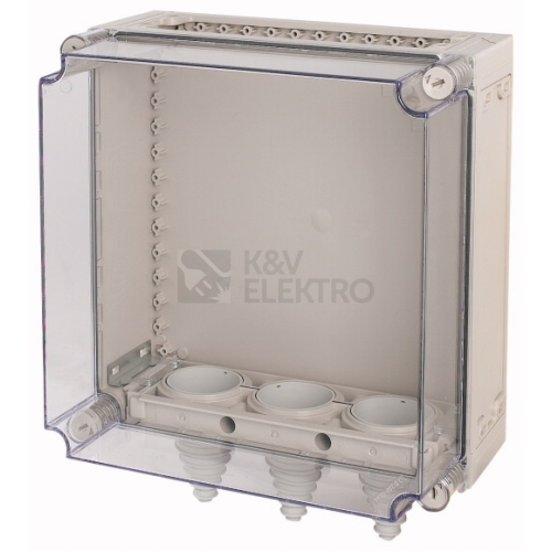 Skříňka s kabelovou přírubou s namontovaným kabelovým vývodem, material: Polykarbonát, odolná proti nárazům, stupeň krytí IP65, patentované upevňovací šrouby víka s integrovaným vyrovnáním přetlaku, bočnice uzavřené, vylamovací, stěny nahoře nebo dole otevřené, kabely lze vložit zepředu přes dělené kabelové spony, upevňovací šrouby s možností plombování, RAL 7032, štěrkově šedá (dolní část skříňky), průhledná, bezbarvá (víko), vestavná hloubka s montážním plechem=200 mm, provedení krytu: průhledné, provedení dolní části: nahoře otevřené, dole kabelové hrdlo