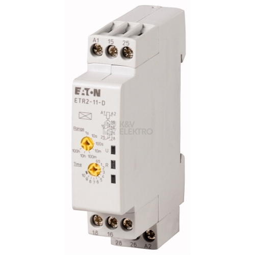 Elektronické časové relé ETR2 podle norem IEC/EN 61812-1, 17,5 mm široké, časová základna 0,05s-100h, 2 přepínací kontakty se zpožděným odpadem, s rozměrem krytky 45 mm vhodný k vestavbě do instalačního rozvaděče