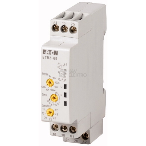 Multifunkční časové relé elektronické ETR2, 17,5 mm široké, časová základna 0,05s-100h, 1 přepínací kontakt nastavitelý, 11 se zpožděným přítahem, 21 s požadavkem zapnutí, 42 blikající, začínající impulzem, 43 blikající, začínající pauzou, 12 se zpožděným odpadem, 22 s požadavkem vypnutí, 82 s jednotlivým impulzem