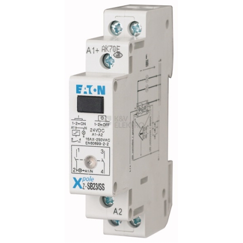 Impulsní relé se spínatelnou LED, řídicí napětí 24V DC, funkce: 2 spínací kontakt, jmenovitý povozní proud při 250V AC podle IEC/EN 60669-2-2: 16A, vestavný rozměr víčka 45 mm, šířka při montáži 1HP (17 ,5 mm), montáž na montážní lištu, průřez svorky 0,5–10 mm² jednodrátový a vícedrátový / 0x5–6 mm² lankový s dutinkou